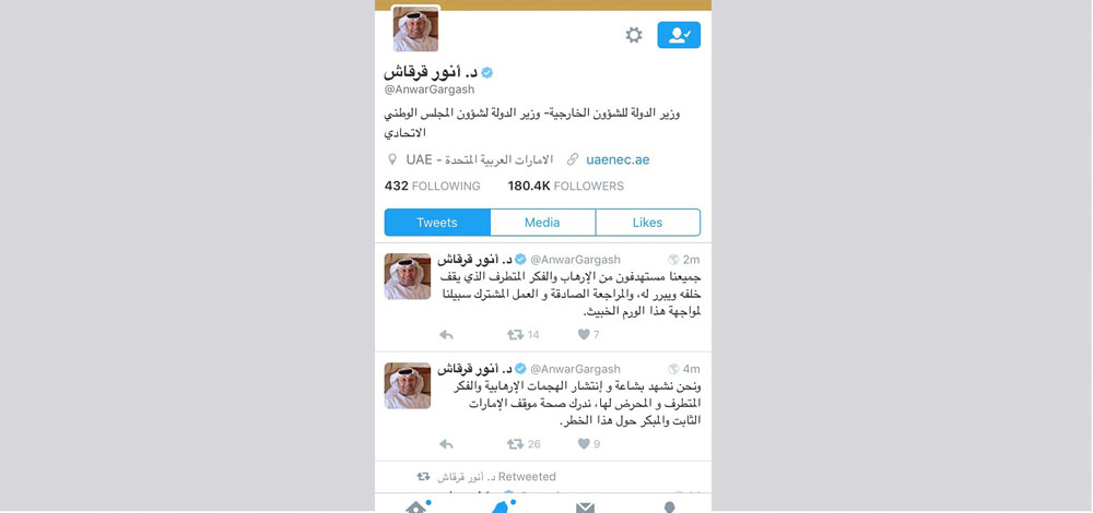 قال وزير الدولة للشؤون الخارجية، وزير الدولة لشؤون المجلس الوطني الاتحادي، الدكتور أنور قرقاش، عبر صفحته على موقع التواصل الإجتماعي "تويتر"، "جميعنا مستهدفون من الإرهاب والفكر المتطرف الذي يقف خلفه ويبرر له، والمراجعة الصادقة و العمل المشترك سبيلنا لمواجهة هذا الورم الخبيث".