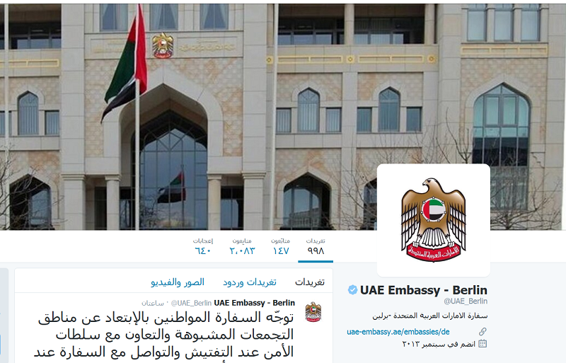 ونشرت تغريدة على حسابها في "تويتر" قالت فيها "نظراً للإجراءات الأمنية المشددة في ألمانيا وأوروبا تنصح السفارة مواطني الدولة بحمل الوثائق الثبوتية معهم في كل تنقلاتهم والإبتعاد عن مناطق التجمعات المشبوهة .