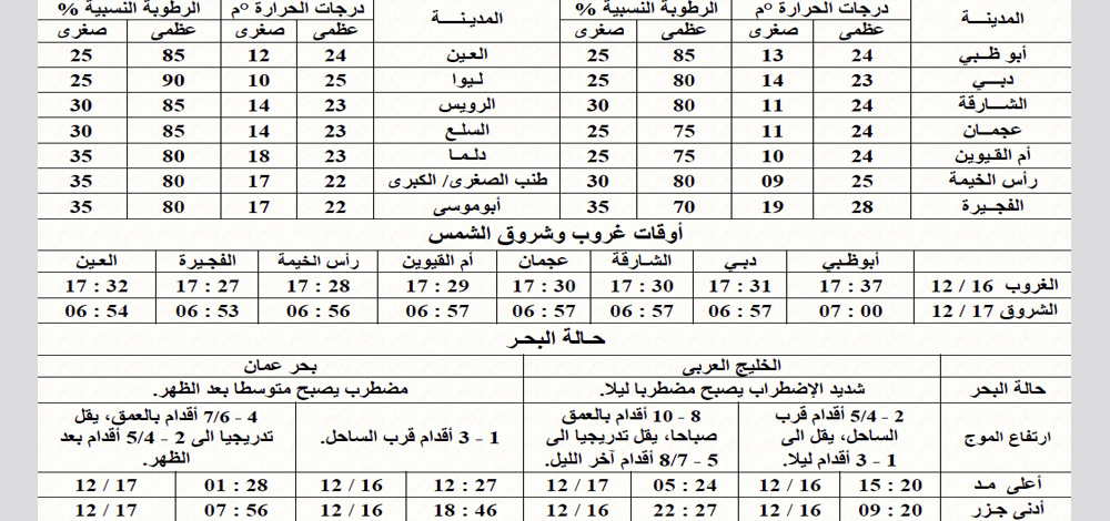 كما توقع المركز أن يكون الطقس خلال اليومين القادمين صحوا الى غائم جزئياً بوج عام، والرياح خفيفة إلى معتدلة السرعة بوجه عام، والبحر مضطرب في الخليج العربي صباح الخميس ويصبح متوسطاً تدريجياً بعد الظهر، وخفيف إلى متوسط في بحر عمان، وتزداد الرطوبة النسبية في ساعات الليل والصباح الباكر على بعض المناطق الساحلية والداخلية مع احتمال تشكل الضباب والضباب الخفيف على بعض تلك المناطق.