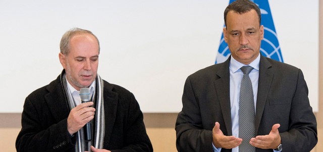 إسماعيل ولد الشيخ أحمد (يمين) خلال بدء المحادثات في سويسرا أول من أمس. إي.بي.إيه