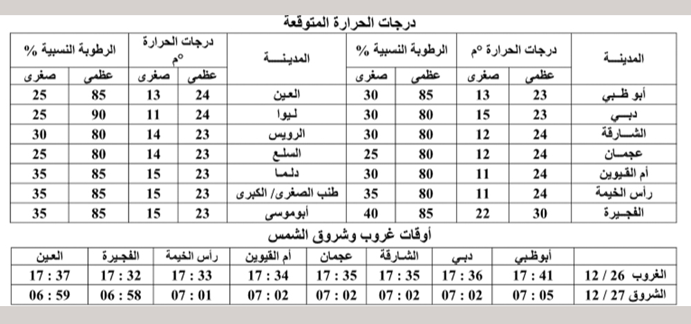 توقع المركز الوطني للأرصاد الجوية والزلازل اليوم، أن يكون الطقس مغبراً وغائما جزئيا إلى غائم أحياناً على بعض المناطق الشمالية والشرقية الجنوبية خاصة صباح الاحد، وتزداد كميات السحب على مناطق متفرقة، مع فرصة لسقوط الأمطار، خاصة على الجزر والسواحل والمناطق الشمالية، ويطرأ انخفاض فى درجات الحرارة على معظم المناطق.