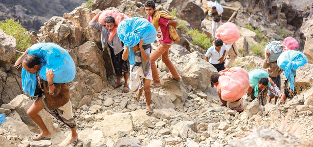 يمنيون يحملون الطرود الغذائية على ظهورهم عبر الجبال بين عدن وتعز. أ.ف.ب