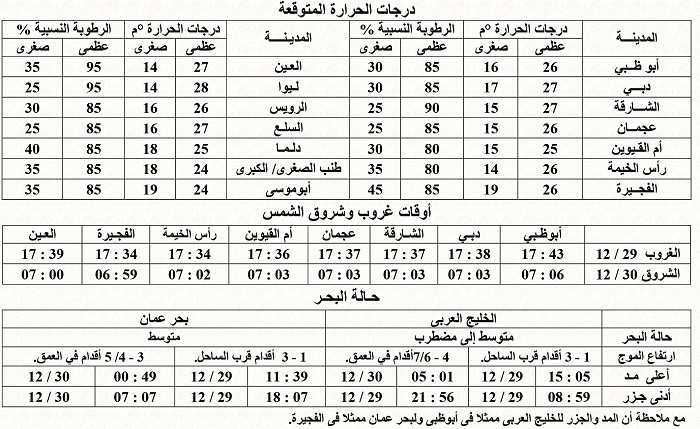 كما توقع المركز أن يكون الطقس خلال اليومين المقبلين صحو إلى غائما جزئيا أحيانا، والرياح خفيفة إلى معتدلة السرعة بوجه عام، والبحر متوسط الموج في الخليج العربي و خفيف إلى متوسط الموج في بحر عمان، وتزداد الرطوبة النسبية على بعض المناطق الساحلية والداخلية خلال الليل والصباح الباكر، مع فرصة لتشكل الضباب والضباب الخفيف على بعض المناطق خاصة الغربية.
