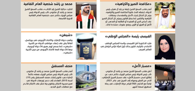 شهد عام 2014 كثيراً من الأحداث البارزة على الساحة المحلية، تصدّرت عناوين الصحف ووسائل الإعلام المرئية والمسموعة المحلية والعالمية. وشملت جملة من المبادرات والإنجازات على المستويات كافة، بينها اصدار صاحب السمو الشيخ خليفة بن زايد آل نهيان ، رئيس الدولة قانونا لمكافحة التمييز والكراهية، واختيار جائزة الشيخ زايد للكتاب صاحب السموّ الشيخ محمد بن راشد آل مكتوم نائب رئيس الدولة رئيس مجلس الوزراء حاكم دبي شخصية العام الثقافية، وانتخاب الدكتورة أمل القبيسي رئيسة للمجلس الوطني الاتحادي بالتزكية، واعتماد ميزانية دبي بنمو 12 %، وتوقيع الدولة والاتحاد الأوروبي، اتفاقاً لإعفاء مواطني الدولة من تأشيرة «الشنغن»، إلى جانب الاعلان عن إطلاق اسم «مسبار الأمل» على مسبار المريخ الإماراتي. وتحرير أسعار الوقود.