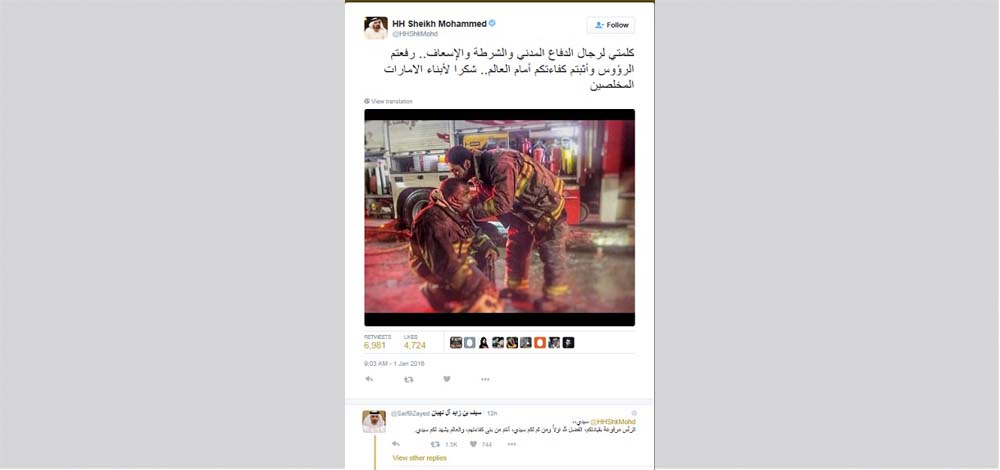 قال الفريق سمو الشيخ سيف بن زايد آل نهيان، نائب رئيس مجلس الوزراء وزير الداخلية، رداً على تغريدة صاحب السمو الشيخ محمد بن راشد آل مكتوم، نائب رئيس الدولة رئيس مجلس الوزراء حاكم دبي، على حساب سموه الرسمي والذي قدم فيها سموه الشكر إلى رجال الدفاع المدني والشرطة والإسعاف، على جهودهم في السيطرة على حريق فندق العنوان، "سيدي.. الرأس مرفوعة بقيادتكم، الفضل لله أولاً ومن ثم لكم سيدي، أنتم من بنى كفاءتهم، والعالم يشهد لكم سيدي".