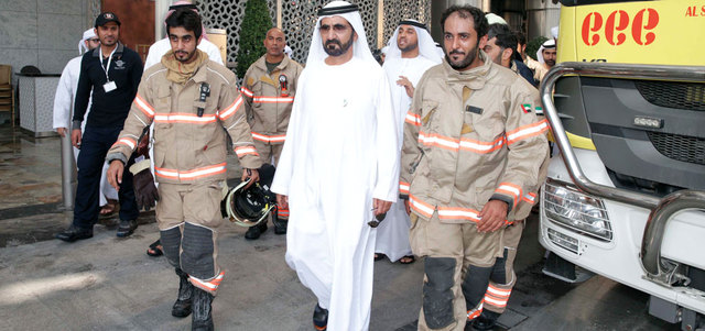 جاء ذلك، خلال زيارة سموه إلى فندق «العنوان» داون تاون، يرافقه سمو الشيخ مكتوم بن محمد بن راشد آل مكتوم، نائب حاكم دبي، حيث حرص سموه على لقاء عناصر الدفاع المدني والشرطة والإسعاف الذين شاركوا في عمليات الإطفاء، وإخلاء النزلاء وتقديم الاسعافات الأولية اللازمة، كما حرص سموه على مصافحتهم جميعا تقديرا من سموه لهذا الدور البطولي الشجاع الذي كان محل التقدير على المستويات الرسمية والشعبية كافة.
