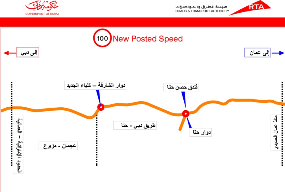 قررت هيئة الطرق والمواصلات خفض السرعة القصوى على طريق دبي - حتا من 120 كم/ساعة إلى 100 كم/ساعة ابتداءً من الحدود الإماراتية العمانية في منطقة مزيرع، ولغاية منفذ عُـمان الحدودي ، وذلك اعتباراً من 20 يناير الجاري.
