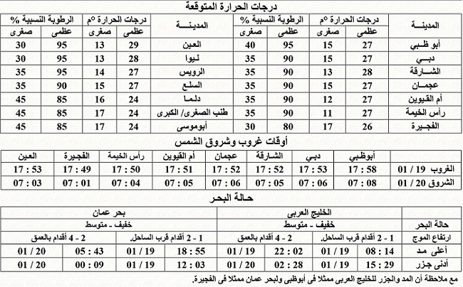 كما توقع المركز أن يستمر الطقس صحواً بوجه عام، وغائماً جزئيا أحياناً، والرياح خفيفة إلى معتدلة السرعة، والبحر متوسط في الخليج العربي ، وخفيف إلى متوسط في بحر عمان، وتزداد الرطوبة النسبية في ساعات الليل والصباح الباكر على المناطق الداخلية والساحلية، مع فرصة لتشكل الضباب على المناطق الداخلية خاصة الغربية من الدولة.