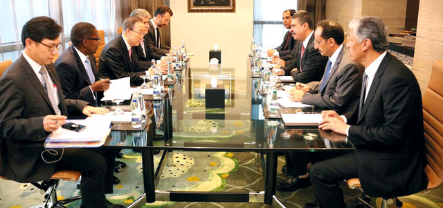 نائب الرئيس اليمني رئيس الوزراء خالد بحاح خلال لقائه الأمين العام للأمم المتحدة بان كي مون في أبوظبي أمس لبحث الوضع في اليمن. سبأ نت