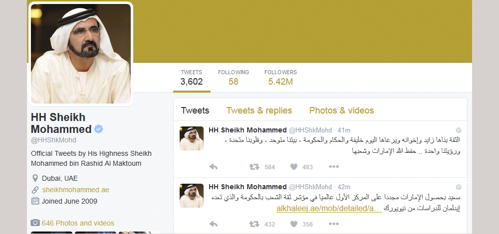 عبر صاحب السمو الشيخ محمد بن راشد آل مكتوم، نائب رئيس الدولة رئيس مجلس الوزراء حاكم دبي، عن سعادته بحصول الإمارات مجددا على المركز الأول عالمياً في مؤشر ثقة الشعب بالحكومة والذي تعده "إيدلمان" للدراسات من نيويورك، وذلك في تغريدة نشرها عبر حسابه في موقع التواصل الاجتماعي "تويتر".