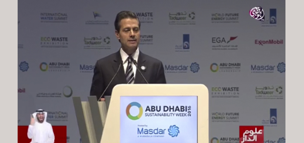 تحدث كل من الأمين العام للأمم المتحدة بان كي مون، والأمين العام لمجلس التعاون الخليجي عبداللطيف الزياني، ورئيس الولايات المتحدة المكسيكية أنريكي بينيا نييتو، ورئيس الحكومة المغربية عبد الإله بنكيران، عن دور أبوظبي في قطاع الطاقة المتجددة وذلك خلال أسبوع أبوظبي للاستدامة 2016.