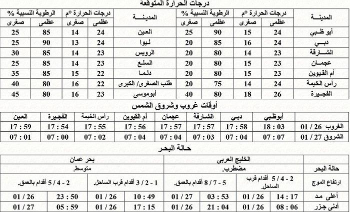 ويكون الطقس غائماً جزئيا في اليومين المقبلين حيث تزداد كميات السحب على بعض المناطق خاصة الساحلية والشرقية، والرياح معتدلة إلى نشطة السرعة وقوية أحياناً ، وتكون مثيرة للغبار والأتربة قد تؤدي إلى تدني مدى الرؤية الأفقية أحياناً على المناطق الداخلية، مع أنخفاض أخر في درجات الحرارة، والبحر مضطرب إلى شديد الاضطراب في الخليج العربي ومتوسط إلى مضطرب في بحر عمان.