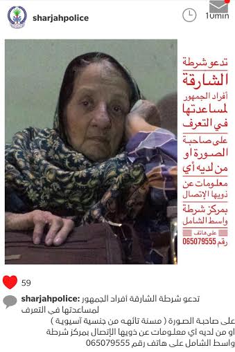 نشرت شرطة الشارقة عبر حسابها في "انستغرام" صورة لمسنة تائهـه من جنسية دولة آسيويـة، وطالبت من أفراد الجمهور مساعدتها في التعرف على صاحبـة الصـورة ، او من لديه أي معلـومات عن ذويها الإتصال بمراكز الشرطة .