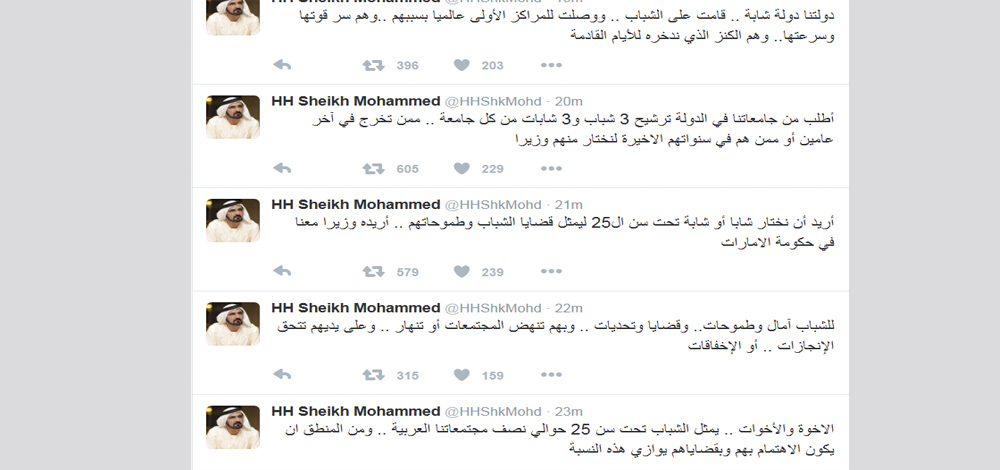 وقال سموه "أريد أن نختار شابا أو شابة تحت سن الـ 25 ليمثل قضايا الشباب وطموحاتهم .. أريده وزيرا معنا في حكومة الامارات".