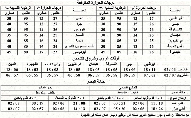 وتوقع المركز أن يكون الطقس في اليومين المقبلين غائماً جزئيا إلى غائم أحياناً خاصة على المناطق الشمالية، ويطرأ انخفاض طفيف آخر في درجات الحرارة، والرياح معتدلة إلى نشطة السرعة بوجه عام، والبحر مضطرب الى متوسط في الخليج العربي، ومتوسط الموج في بحر عمان، وتزداد الرطوبة النسبية ليلاً وفي الصباح الباكر على بعض المناطق الداخلية، وقد يتشكل الضباب المتفرق.