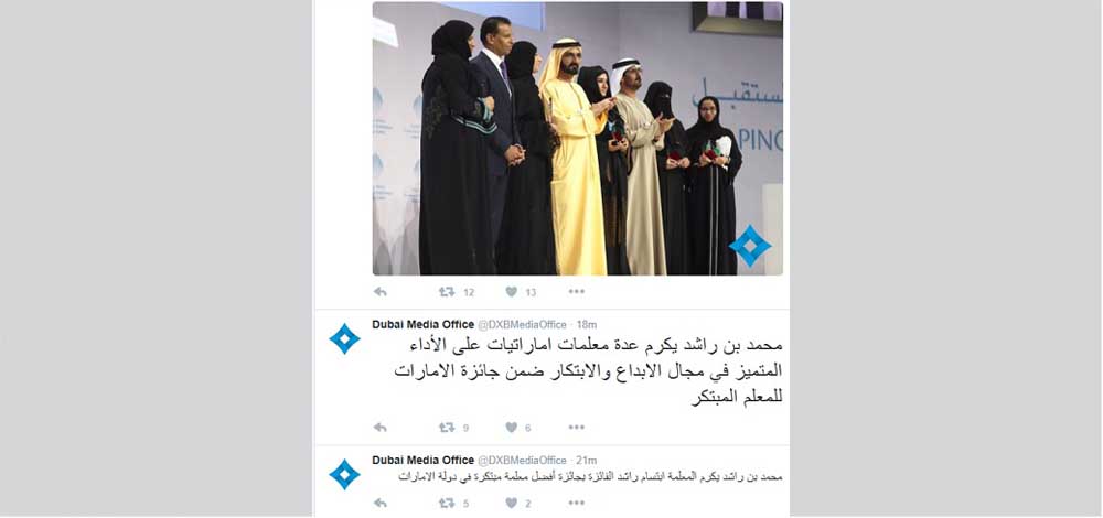 كرم صاحب السمو الشيخ محمد بن راشد آل مكتوم نائب رئيس الدولة رئيس مجلس الوزراء حاكم دبي، المعلمة ابتسام راشد الفائزة بجائزة أفضل معلمة مبتكرة في دولة الامارات، كما ذكر المكتب الإعلامي لحكومة دبي عبر حسابه الرسمي بموقع التواصل الإجتماعي "تويتر".