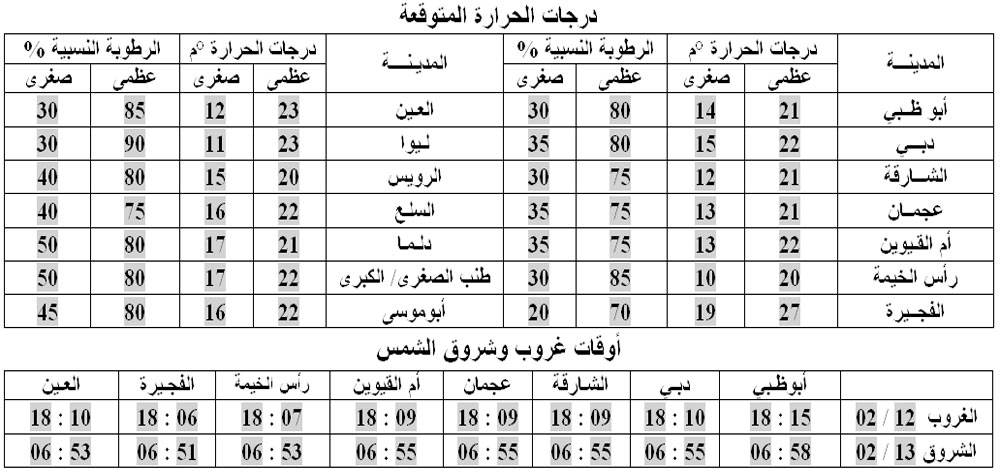 توقع المركز الوطني للأرصاد أن يكون الطقس غائماً جزئيا، والرياح خفيفة إلى معتدلة تنشط أحيانا فوق البحر، والبحر مضطرب يصبح متوسط الموج ليلا في الخليج العربي، وخفيف إلى متوسط الموج في بحر عمان وتزداد الرطوبة النسبية ليلاً وفي الصباح الباكر على مناطق متفرقة ويحتمل تشكل الضباب أوالضباب الخفيف على بعض المناطق الداخلية.