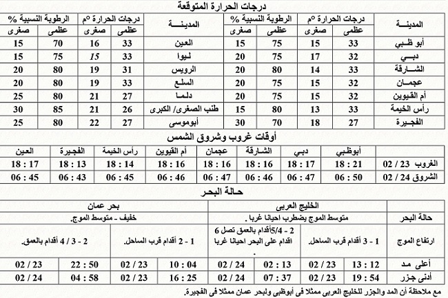 ويكون الطقس لليومين المقبلين مغبرا إلى غائم جزئيا، وتزداد كميات السحب على مناطق متفرقة خاصة الغربية ويحتمل سقوط بعض الامطار الخفيفة، مع انخفاض في درجات الحرارة والرياح خفيفة إلى معتدلة السرعة تنشط أحيانا وتكون مثيرة لبعض الغبار غربا، والبحر مضطرب في الخليج العربي ومتوسط الموج في بحر عمان.