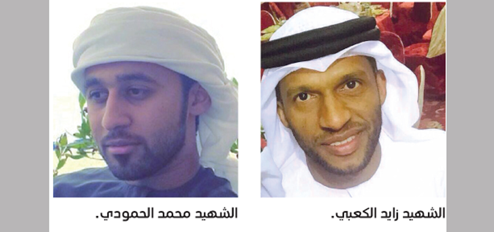 أعلنت القيادة العامة للقوات المسلحة استشهاد البطلين، زايد علي الكعبي، ومحمد عبيد الحمودي، من جنودها البواسل، ضمن قواتها المشاركة في عملية «إعادة الأمل»، مع قوات التحالف العربي، الذي تقوده المملكة العربية السعودية، للوقوف مع الشرعية في اليمن. وتقدمت القيادة العامة للقوات المسلحة بتعازيها ومواساتها إلى ذوي الشهيدين، سائلة الله عزّ وجلّ أن يسكنهما فسيح جناته، ويتغمدهما بواسع رحمته. فيما أكدت أسرتا الشهيدين فخرهما واعتزازهما بنيل ابنيهما الشهادة، في سبيل رفعة الوطن الغالي، ودفاعاً عن كلمة الحق والشرعية.