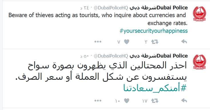 أهابت شرطة دبي أفراد الجمهور بالحذر من المحتالين الذي يظهرون بصورة سواح يستفسرون عن شكل العملة أو سعر الصرف، وذلك عبر حسابها الرسمي بموقع التواصل الإجتماعي "تويتر" قائلة في تغريدة "احذر المحتالين الذي يظهرون بصورة سواح يستفسرون عن شكل العملة أو سعر الصرف".