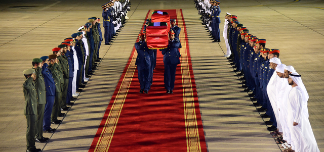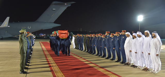 وصل إلى مطار البطين الخاص في أبوظبي، أمس، جثمانَي الشهيدين زايد علي الكعبي ومحمد عبيد الحمودي، من شهداء الوطن الأبطال، على متن طائرة عسكرية تابعة للقوات الجوية والدفاع الجوي. وجرت على أرض المطار المراسم العسكرية الخاصة باستقبال جثماني الشهيدين، حيث كان في الاستقبال عدد من كبار ضباط القوات المسلحة. وكانت القيادة العامة للقوات المسلحة نعت، أول من أمس، الشهيدين اللذين انتقلا إلى جوار ربهما خلال أدائهما لواجبهما الوطني في عملية «إعادة الأمل»، ضمن التحالف العربي الذي تقوده المملكة العربية السعودية للوقوف مع الشرعية في اليمن.