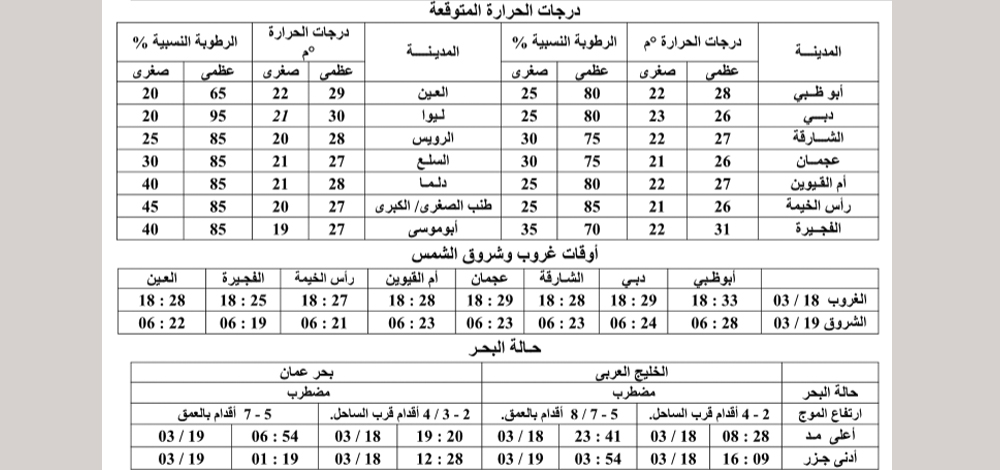 أما البحر فمضطرب في الخليج العربي وبحر عمان ، وتزداد الرطوبة النسبية في ساعات الليل والصباح الباكر على بعض المناطق الداخلية وقد يتشكل بعض الضباب الخفيف.