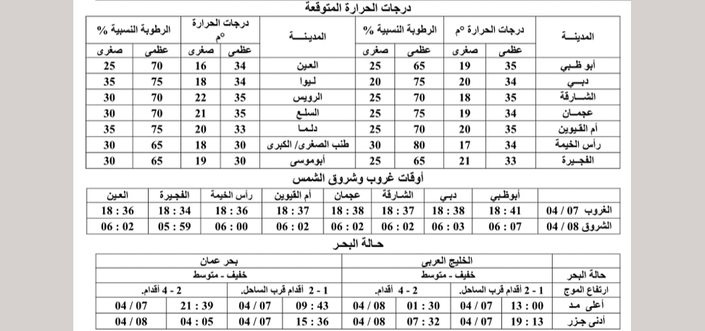 توقع المركز الوطني للأرصاد الجوية والزلازل اليوم، ان يكون الطقس صحوا إلى غائم جزئي ومغبرا أحيانا، مع إرتفاع أخر طفيف في درجات الحرارة، وتزداد كميات السحب خلال الليل على بعض المناطق مع إحتمال سقوط أمطار متفرقة خاصة على المناطق الشرقية والشمالية، والرياح خفيفة إلى معتدلة السرعة بوجه عام قد تنشط أحيانا مع وجود السحب وقد تكون مثيرة لبعض الغبار احيانا.