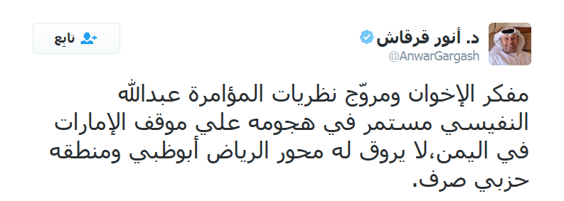 قال وزير الدولة للشؤون الخارجية الدكتور أنور قرقاش في تغريدات على حسابه الخاص على " تويتر " إن " مفكر الإخوان ومروّج نظريات المؤامرة عبدالله النفيسي مستمر في هجومه على موقف الإمارات في اليمن، لا يروق له محور الرياض أبوظبي، ومنطقه حزبي صرف".