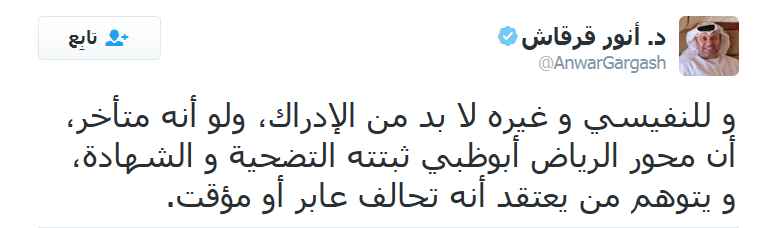 وأكد قرقاش "للنفيسي و غيره لا بد من الإدراك، ولو أنه متأخر، أن محور الرياض أبوظبي ثبتته التضحية و الشهادة، و يتوهم من يعتقد أنه تحالف عابر أو مؤقت".