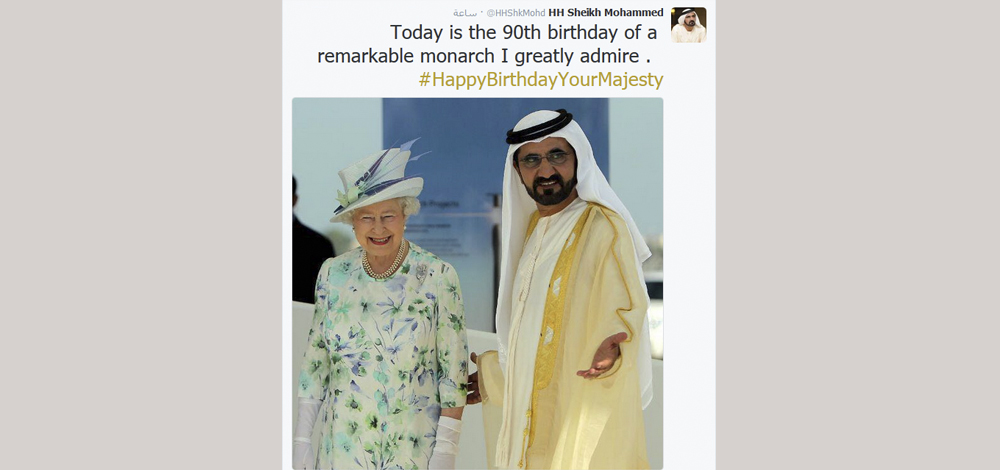 هنأ صاحب السمو الشيخ محمد بن راشد آل مكتوم، نائب رئيس الدولة رئيس مجلس الوزراء حاكم دبي، في تغريدة له عبر حسابه في موقع التواصل الاجتماعي "تويتر"، الملكة اليزابيث الثانية بمناسبة يوم ميلادها التسعين.