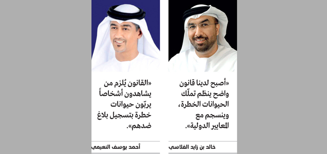 وأوضح النعيمي أن «الأشخاص الذين يشاهدون جيرانهم أو أصدقاءهم يربّون حيوانات خطرة، ملزمون بموجب القانون بتسجيل بلاغ بذلك، وإلا تعرضوا لغرامات مالية تصاعدية تبدأ من 10 آلاف درهم»، متابعاً أن «اللجنة استحدثت نصاً في القانون يفرض وضع قلادة تعريفية لكل حيوان مصنف ضمن الحيوانات الخطرة، تشير إلى أنه مسجل رسمياً لدى السلطات المختصة، وأنه - أي الحيوان - خضع للفحوص البيطرية اللازمة، وحصل على جرعات وأمصال طبية، وما إلى ذلك من تدابير».