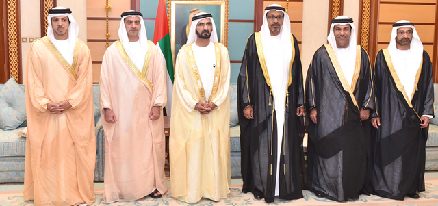 محمد بن راشد يتوسط السفراء الجدد. وام