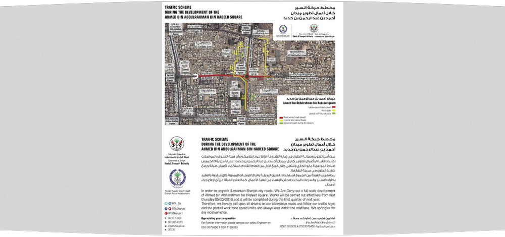 ونوهت طرق الشارقة عبر حسابها الرسمي بموقع التواصل الإجتماعي "تويتر"، إلى اتباع اللوحات الإرشادية والتقيد بحارات السير عند عبور منطقة تطوير ميدان أحمد بن عبدالرحمن بن حديد.