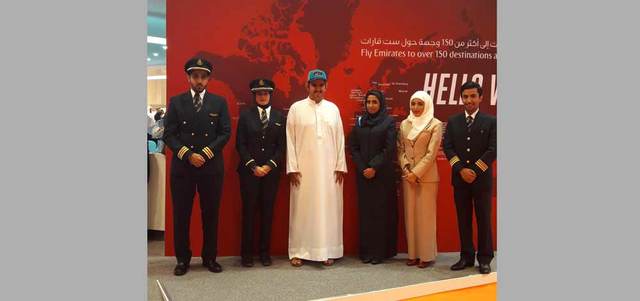 «طيران الإمارات» حققت رغبة الجناحي في التصوير مع طاقم العمل الموجود بالمنصة. تصوير: أشوك فيرما