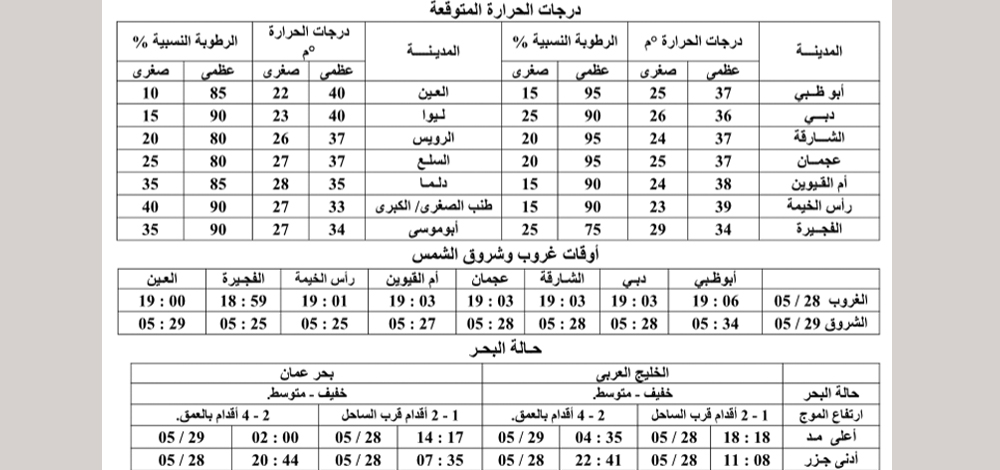 فيما يكون البحر خفيف إلى متوسط الموج فى الخليج العربي وبحر عمان، وتزداد الرطوبة النسبية في ساعات الليل والصباح الباكر على بعض المناطق الساحلية والداخلية مع احتمال تشكل بعض الضباب أو الضباب الخفيف.