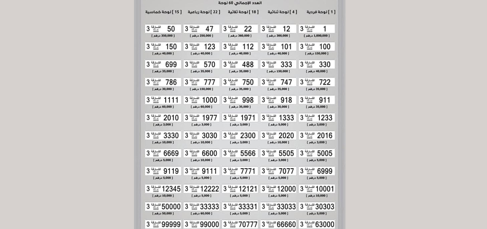 ويعرض المزاد 60 رقماً مميزا للوحات المركبات الأحادية والثنائية والثلاثية والرباعية والخماسية مع القيمة الأسمية لكل فئة.