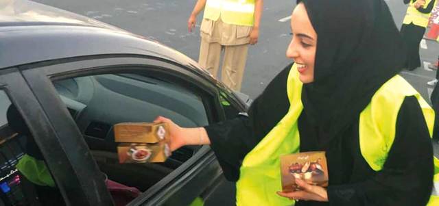 وزيرة الدولة لشؤون الشباب شما بنت سهيل بن فارس المزروعي توزع وجبات الإفطار على السائقين برفقة شباب الإمارات.