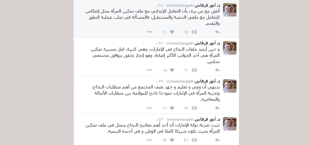 وتابع قرقاش في تغريدة أخرى: "أتفق مع من يرى بأن التعامل الإيجابي مع ملف تمكين المرأة يمثل إنعكاس للتعامل مع ملفي التنمية والمستقبل، فالمسألة في صلب عملية التطور والتقدم".