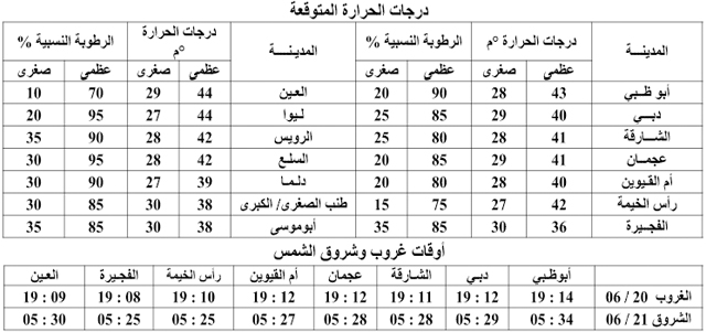 توقع المركز الوطني للأرصاد الجوية والزلازل أن يكون الطقس خلال اليومين القادمين صحواً إلى غائم جزئياً ومغبراً أحياناً مع فرصة لتكون بعض السحب الركامية على المناطق الجبلية الشرقية والجنوبية ظهراً، والرياح خفيفة الى معتدلة السرعة والبحر خفيف الى متوسط الموج في الخليج العربي وبحر عمان، وتزداد الرطوبة النسبية ليلا وفي الصباح الباكر على بعض المناطق الساحلية والداخلية، مع احتمال تشكل الضباب أو الضباب الخفيف، خاصة غرباً.