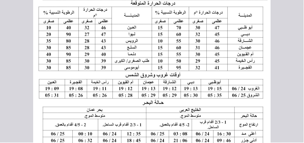 توقع المركز الوطني للرصاد الجوية والزلازل ان يكون الطقس خلال عطلة نهاية الأسبوع حاراً بوجه عام، وغائماً جزئياً ومغبراً أحياناً على بعض المناطق خاصة الجنوبية والشرقية، والرياح خفيفة الى معتدلة السرعة، قد تنشط أحيانا خلال النهار شمالاَ وشرقا ، والبحر متوسط إلى مضطرب أحيانا في الخليج العربي و خفيف إلى متوسط في بحر عمان، وتزداد الرطوبة النسبية ليلا وفي الصباح الباكر على بعض المناطق الساحلية الشرقية والغربية.