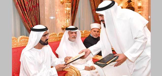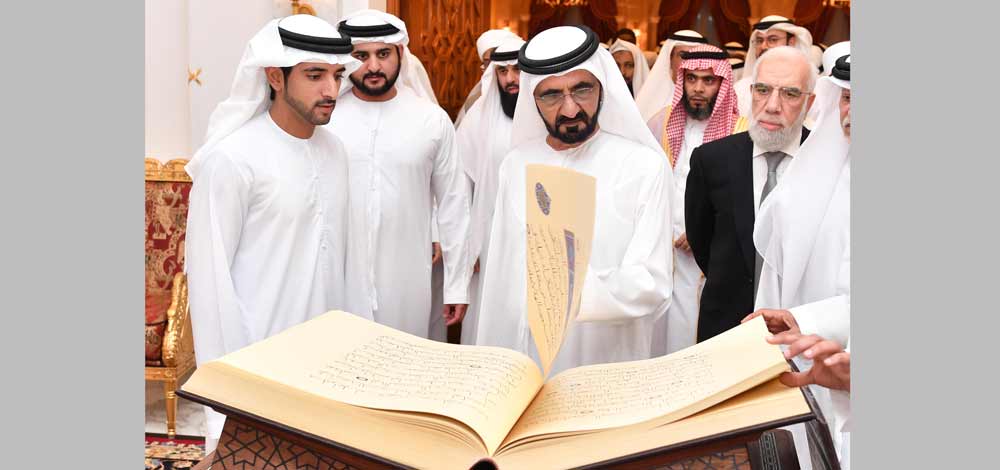 من جهة ثانية، تسلم صاحب السمو الشيخ محمد بن راشد آل مكتوم من ولي عهده، سمو الشيخ حمدان بن محمد بن راشد آل مكتوم، نسخة نادرة من المصحف الشريف، قدمها لسموه، بحضور علماء الدين ضيوف الإمارات، هدية من أنجاله بمناسبة الشهر الفضيل.
