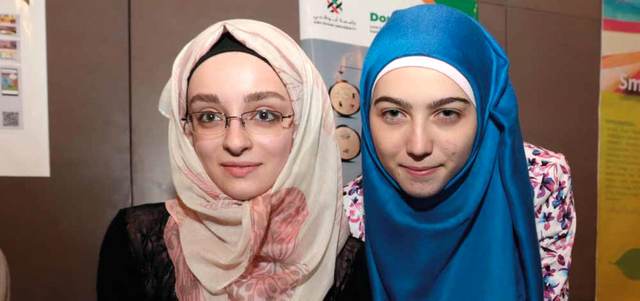 باسمة (يمين) وسهير خلال عرض ابتكارهما بـ«تطبيقات الهواتف الذكية 2016». الإمارات اليوم