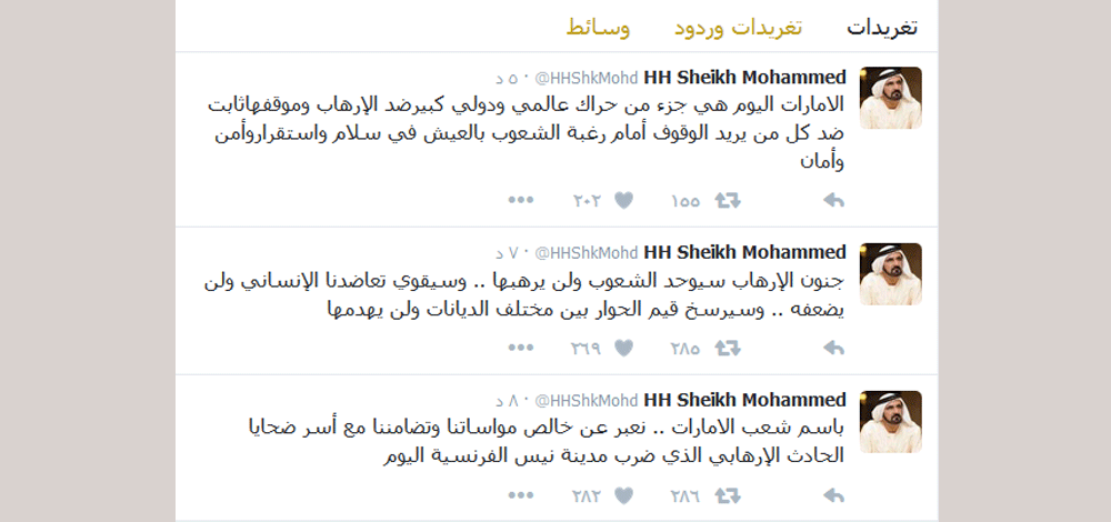 قال صاحب السمو الشيخ محمد بن راشد آل مكتوم نائب رئيس الدولة رئيس مجلس الوزراء حاكم دبي، عبر حسابه في موقع التواصل الاجتماعي "تويتر": "باسم شعب الامارات .. نعبر عن خالص مواساتنا وتضامننا مع أسر ضحايا الحادث الإرهابي الذي ضرب مدينة نيس الفرنسية اليوم".