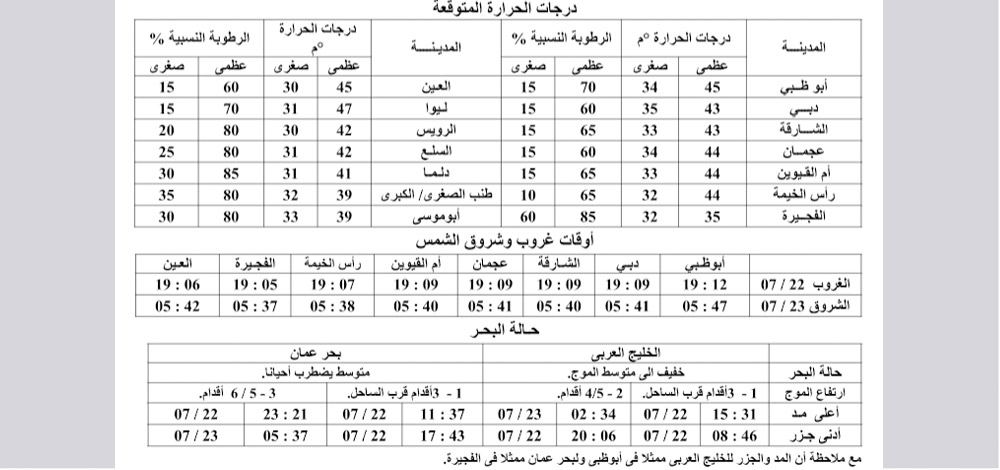 توقع المركز الوطني للأرصاد الجوية والزلازل أن يكون الطقس بوجه عام مغبراً، فيما تميل درجات الحرارة للإرتفاع التدريجى، ويكون الطقس حارا إلى شديد الحرارة على معظم المناطق، وغائم جزئياً أحياناً، مع فرصة لتكون السحب الركامية بعد الظهر على المناطق الشرقية، قد يصاحبها سقوط بعض الامطار، والرياح معتدلة الى نشطة السرعة، ومثيرة للغبار والأتربة مع تدنى مدى الرؤية الافقية، خاصة على المناطق المكشوفة، والبحر متوسط يضطرب مع ليل السبت في الخليج العربي ومضطرب بوجه عام فى بحر عمان.