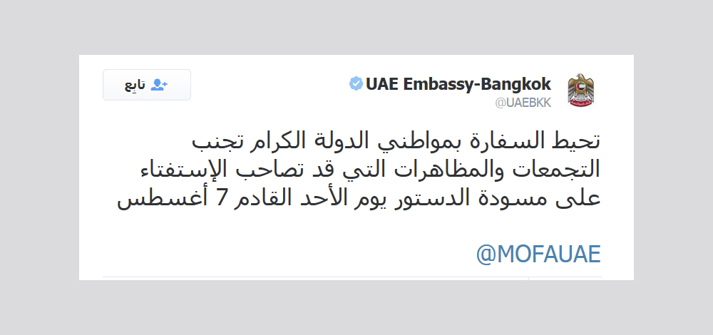 حذرت سفارة الدولة في العاصمة التايلاندية بانكوك، المواطنين من الاقتراب من أماكن التجمعات أو المظاهرات التي قد تصاحب الاستفتاء على مسودة الدستور، الذي من المقرر أن يجري الأحد المقبل.