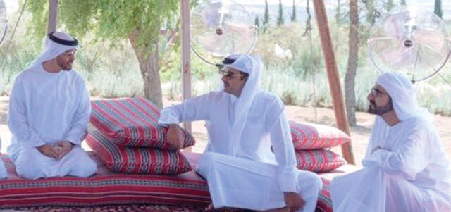 صورة تجمع سمو الشيخ تميم بن حمد آل ثاني، أمير دولة قطر، وصاحب السمو الشيخ محمد بن راشد آل مكتوم، نائب رئيس الدولة رئيس مجلس الوزراء حاكم دبي، وصاحب السمو الشيخ محمد بن زايد آل نهيان، ولي عهد أبوظبي نائب القائد الأعلى للقوات المسلحة، نشرها وزير خارجية قطر، الشيخ محمد بن عبدالرحمن بن جاسم آل ثاني، في لقاء وصفه بلقاء «خير ومحبة».