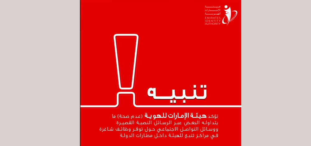 أكدت هيئة الإمارات للهوية عبر تغريدة لها في حسابها على موقع التواصل الاجتماعي "تويتر" عدم صحة ما يتداوله البعض عبر الرسائل النصية ووسائل التواصل الاجتماعي حول توفر وظائف شاغرة في مراكز تتبع للهيئة داخل مطارات الدولة.