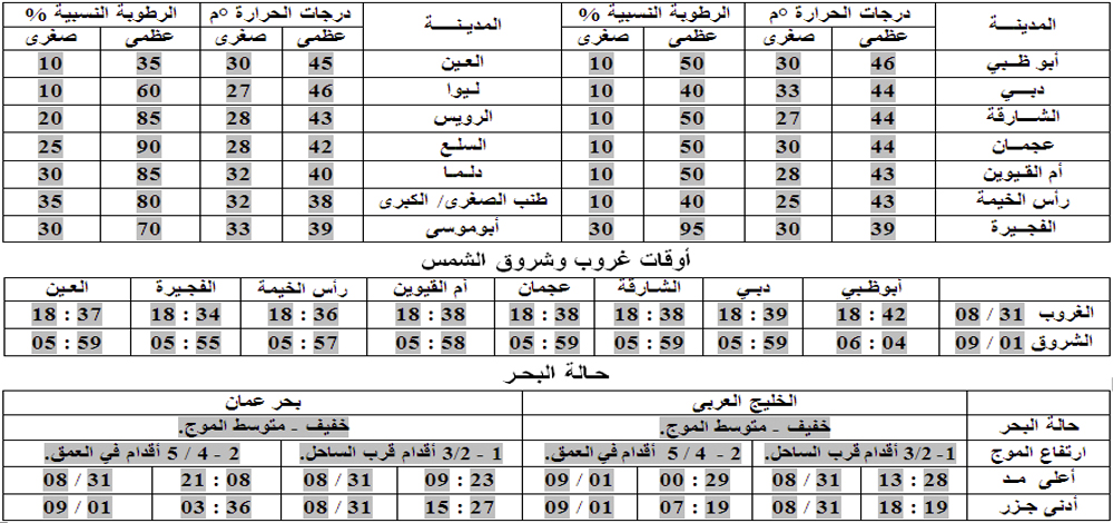 توقع المركز الوطني للأرصاد الجوية والزلازل أن يكون الطقس في الدولة حاراً بوجه عام، ومغبراً إلى غائم جزئياً أحياناً على بعض المناطق، وقد تتكون بعض السحب الركامية على المناطق الشرقية بعد الظهر، والرياح خفيفة إلى معتدلة السرعة بوجه عام تنشط أحيانا، وتزداد الرطوبة النسبية خلال ساعات الليل وصباح الغد الباكر على بعض المناطق الساحلية، وقد يتشكل بعض الضباب الخفيف خاصة غربا.