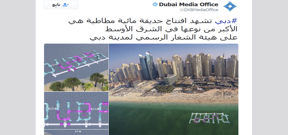 ذكر المكتب الاعلامي لحكومة دبي عبر حسابه الرسمي في موقع التواصل الاجتماعي "تويتر": " ان دبي تشهد افتتاح حديقة مائية مطاطية هي الأكبر من نوعها في الشرق الأوسط على هيئة الشعار الرسمي لمدينة دبي".