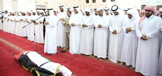 أدّى صاحب السموّ الشيخ سعود بن صقر القاسمي، عضو المجلس الأعلى حاكم رأس الخيمة، أمس، بجانب مئات من أهالي إمارة رأس الخيمة، صلاة الجنازة على جثمان شهيد الوطن، راشد أحمد عبدالله الحبسي، الذي قدم روحه فداءً للواجب الوطني، وارتقى إلى العلا مع من سبقوه من إخوانه الشهداء من جنودنا البواسل المشاركين ضمن قوة التحالف العربي في عملية «إعادة الأمل في اليمن»، التي تقودها المملكة العربية السعودية الشقيقة، للوقوف إلى جانب الشرعية في اليمن.